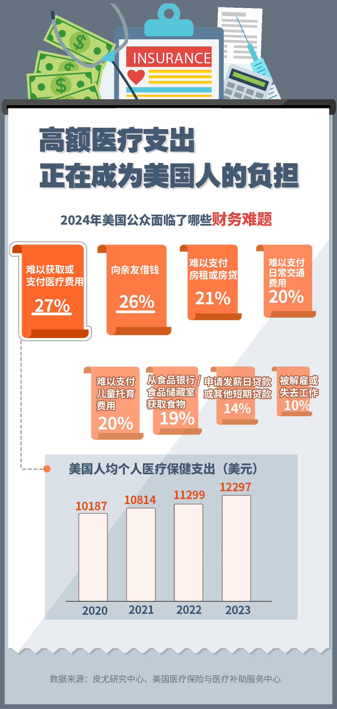皮尤研究中心调查显示,过去的2024年中,27%的美国人表示遇到过难以支付医疗费用的情况,比例高居各项财务困境之首,甚至超过房租(21%)和交通(20%)。