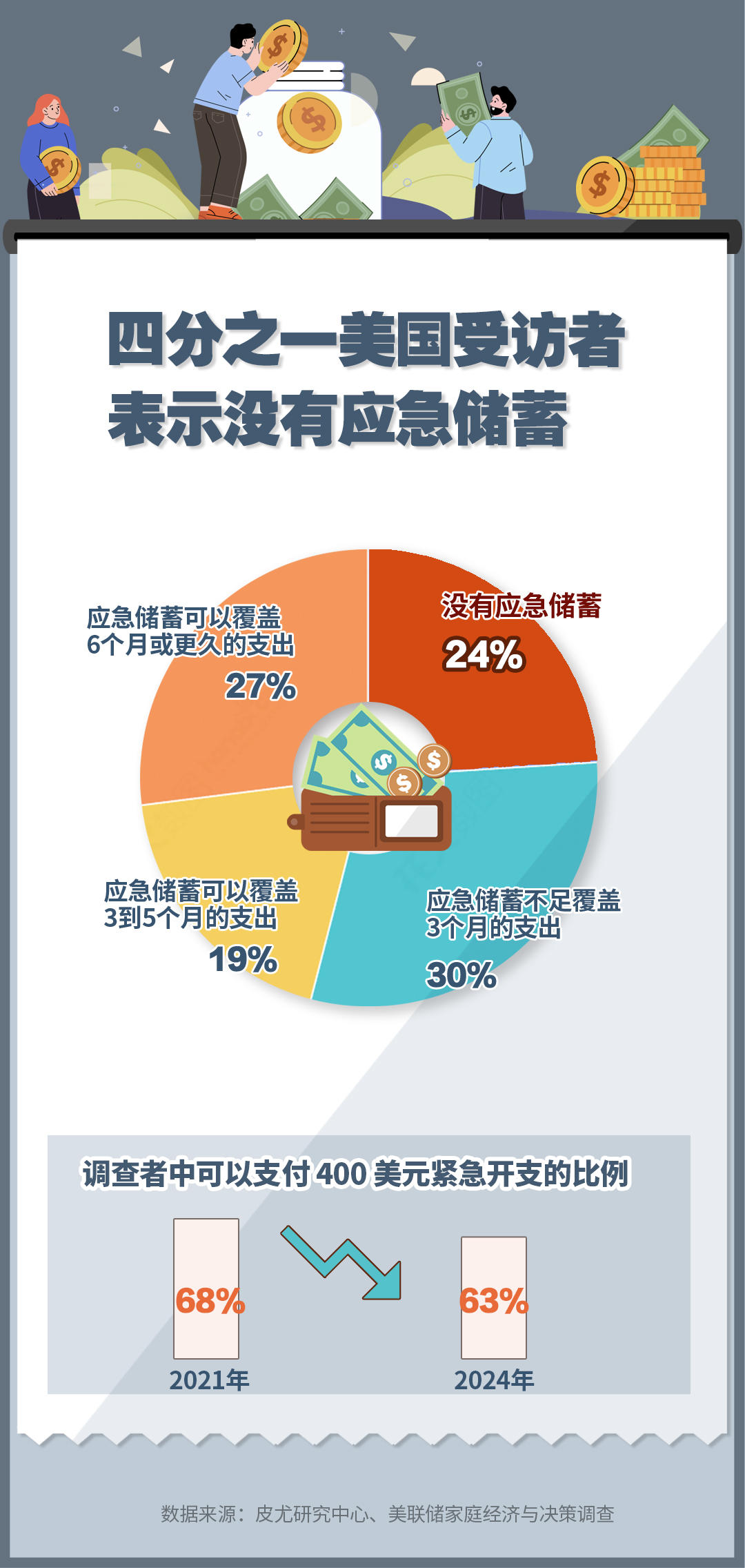 皮尤研究中心指出,24%的美国人没有任何应急储蓄,另有30%的储蓄不足以支撑三个月基本开销。