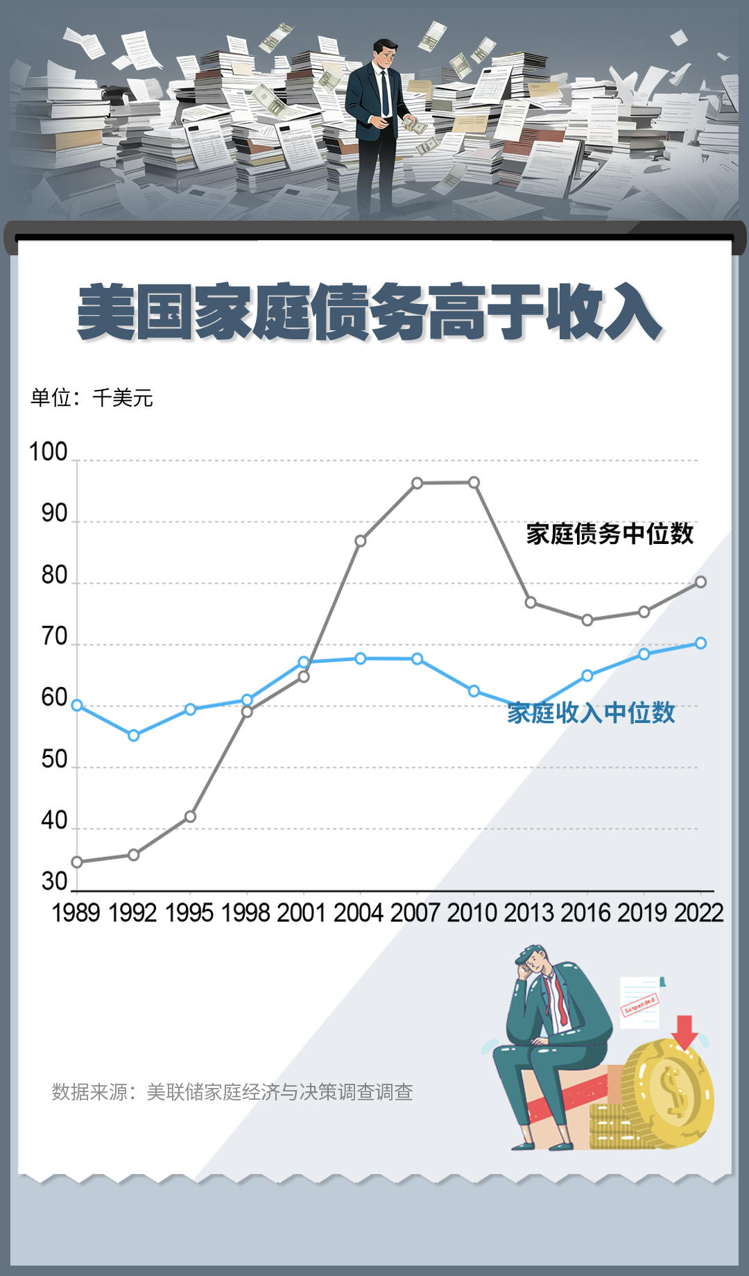 自1989年以来,家庭收入中位数仅从约6万美元微增至2022年的7万美元,而家庭债务中位数却从3.5万美元飙升至8万美元以上,翻了一倍多。尤其在次贷危机前后,债务激增远超收入增长,即便近年收入略有回升,债务负担仍高居不下。