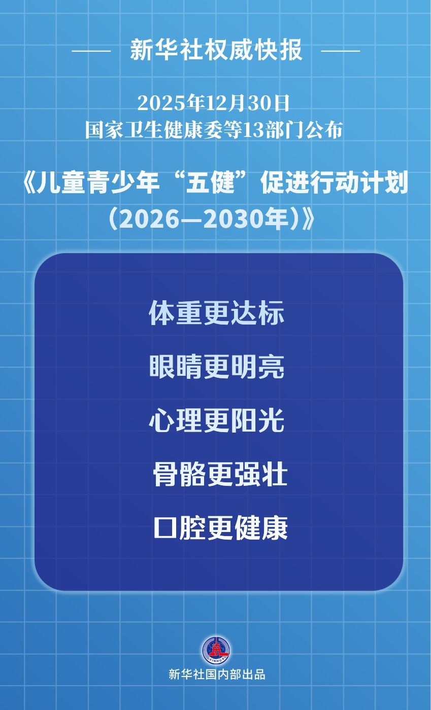国家卫生健康委等13部门2025年12月30日公布《儿童青少年“五健”促进行动计划(2026—2030年)》,要求加强儿童青少年肥胖、近视、心理行为异常、脊柱弯曲异常和龋齿等防治,促进儿童青少年体重、视力、心理、骨骼、口腔健康。