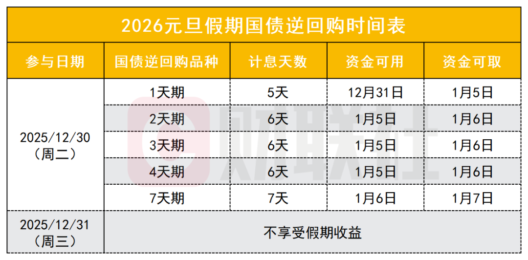 倘若选择2天期、3天期、4天期国债逆回购,均将获得6天利息,不过资金要到节后1月5日才处于可用状态,1月6日资金可取。