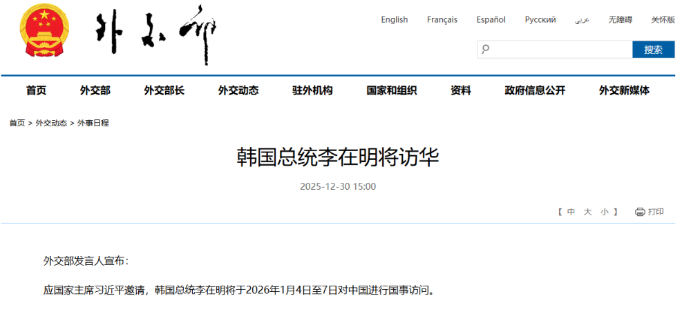 外交部发言人宣布:应国家主席习近平邀请,韩国总统李在明将于2026年1月4日至7日对中国进行国事访问。