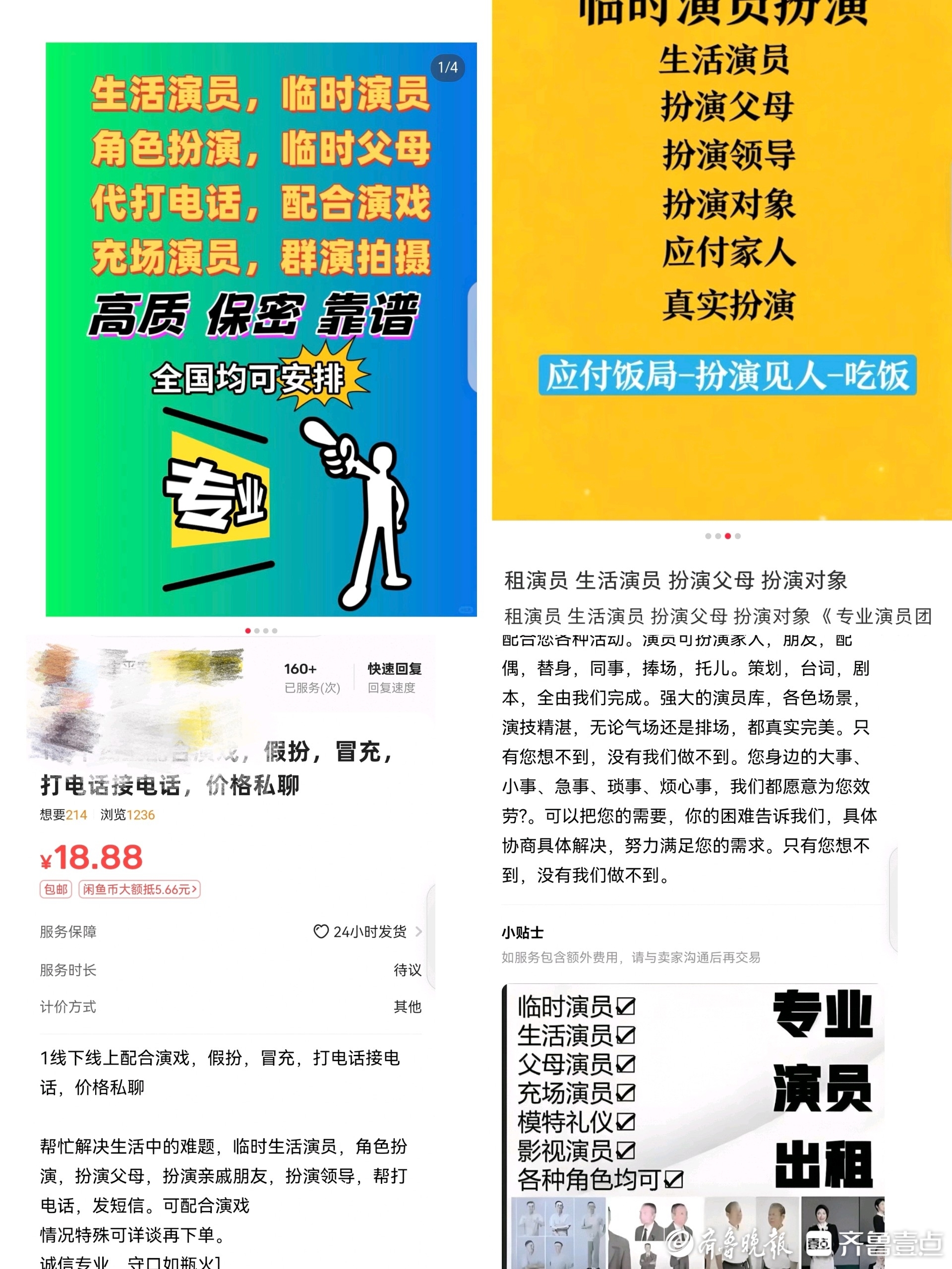 生活中,这类“租人扮角”的需求在社交平台并不少见,其行业生态究竟如何?记者在多个社交平台检索发现,提供私人情景演出服务的信息随处可见,服务范围涵盖扮演父母、亲戚、同事、领导、专业人士等各类角色,既可线上视频出镜,也可线下见面互动。整个过程毫无资质审核,接单流程十分简易,通常只需通过社交平台或微信沟通需求、确认报价、支付定金,演出结束后结清尾款即可。