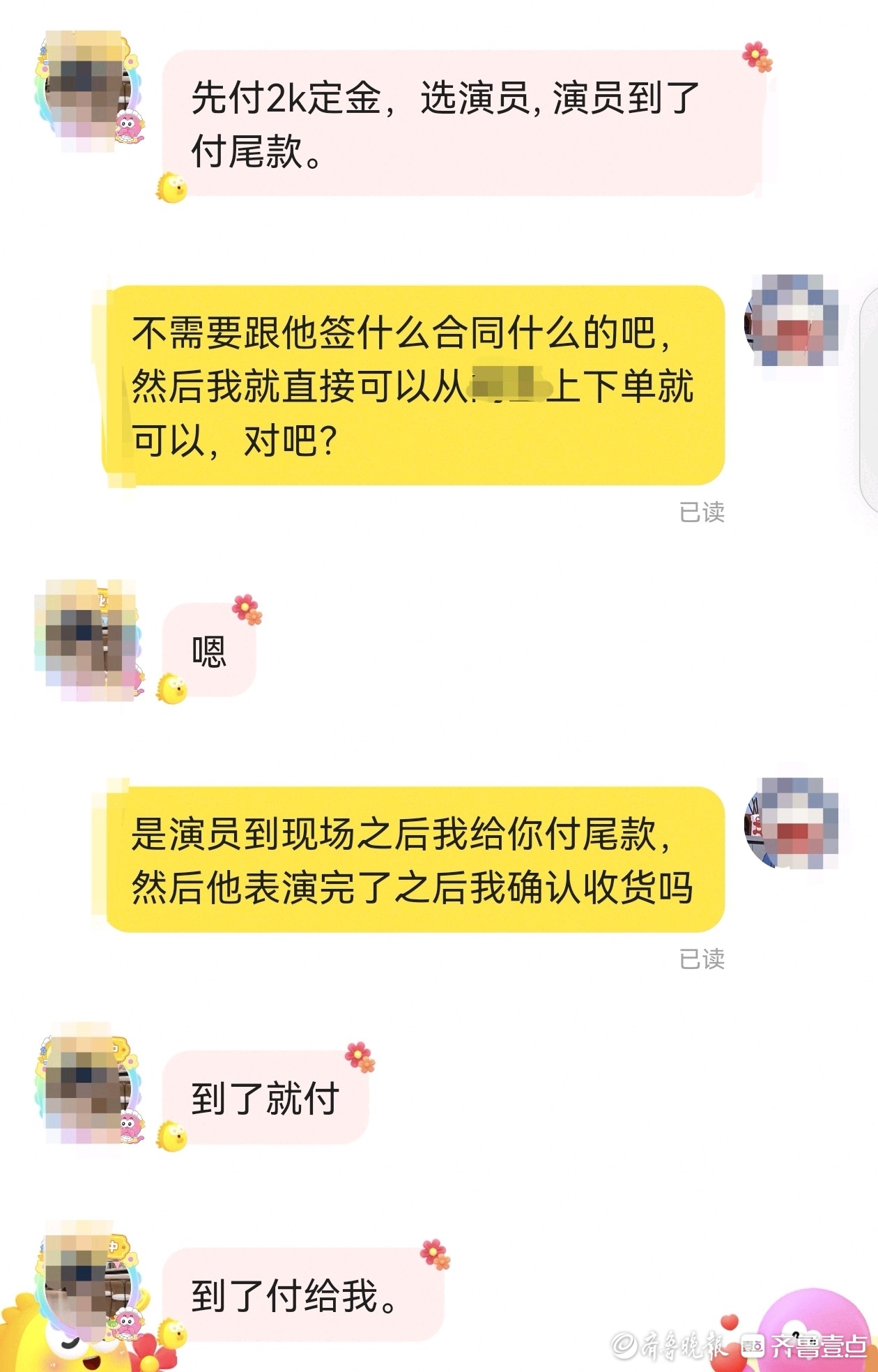 在短剧行业从业两年半的王帅(化名)告诉记者,这类私人演出早已成为不少短剧从业者的重要收入来源。他坦言,这类演出接单门槛极低,全程没有任何正规流程,基本靠平台或微信沟通需求、敲定细节,合作时先付定金,表演结束后再结清尾款。“圈内大多是拿钱办事、不问私事,没人会去深究雇主的真实目的,只按要求演好角色就行,极少有人会考虑到演出背后可能暗藏的法律风险。”