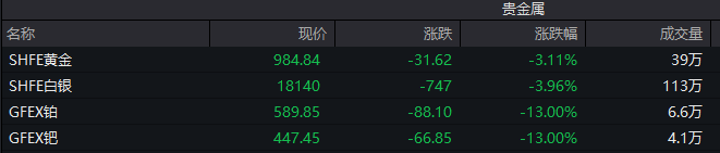 12月30日收盘,铂、钯期货主力合约跌停,跌幅13%。不仅是铂金,贵金属板块整体回调。截至日盘收盘,沪金跌3.11 %,报984.84元/克,沪银跌3.96%,报18140.00元/千克。