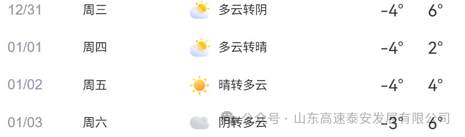 据天气预报显示,假期期间泰安天气多为多云转晴,气温在-4℃~6℃之间,请注意出行备好保暖装备。