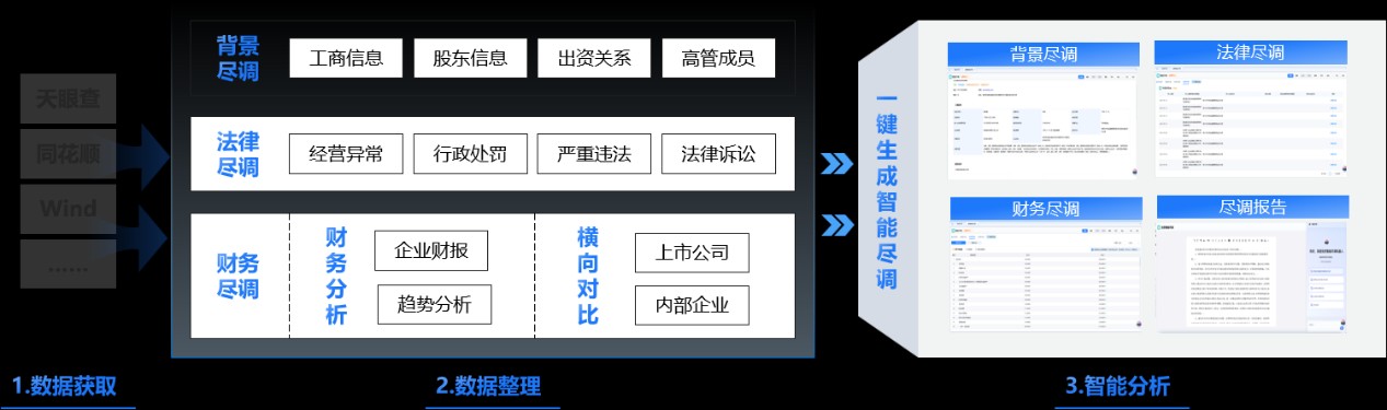 智能尽调通过对接外部机构获取行业、政策等信息,整合财务、工商、司法等数据,智能输出被投企业尽职调查报告,包含背景尽调、财务尽调、法律尽调等,并智能核实财务报表、审计意见以及资产评估等,揭示重大风险,严防非主业、非优势领域盲目投资,为决策层提供全面、客观、审慎的评估报告,规避风险,保障投资安全与回报。