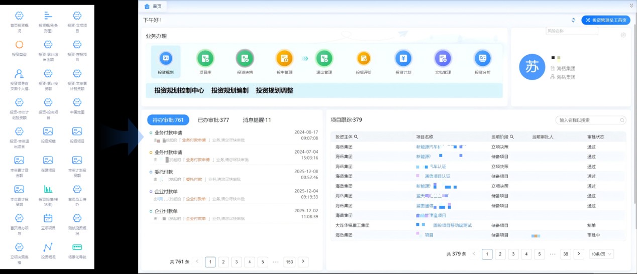 浪潮海岳投资管理8.0预置投资概况、项目跟踪、累计投资额等60余个小部件,快速搭建场景化工作台,满足不同角色对不同项目、不同阶段的个性化管理需求。如投资经理可以通过首页面查看投资分布情况、在建项目、项目进度等项目全景。各个小部件之间支持关联业务穿透和数据多维联查,构建灵活、联动、高效的场景化管理体验。