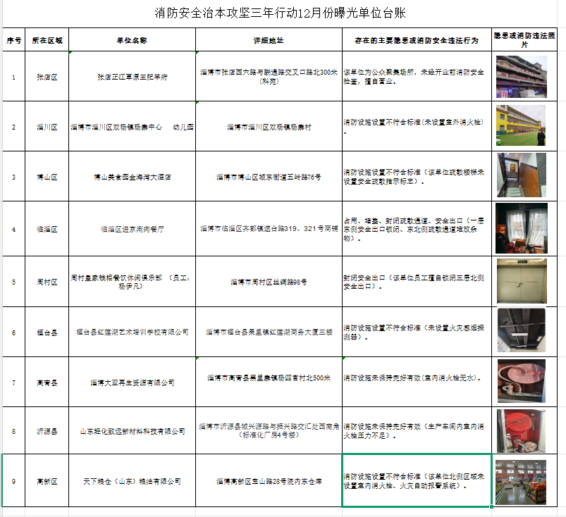 消防安全治本攻坚三年行动工作开展以来,淄博市消防救援支队紧盯重点领域、聚焦关键环节,精准发力、重拳除患,多措并举、综合施策,严格落实重点整治要求,全力防范化解重大安全风险。为有效利用舆论监督和社会监督手段,形成高压震慑,切实发挥警示作用,推动隐患整改,12月30日,淄博市消防救援支队发布全市消防安全治本攻坚三年行动12月份曝光单位台账,对9家火灾隐患、消防违法行为突出单位或个人开展集中曝光。