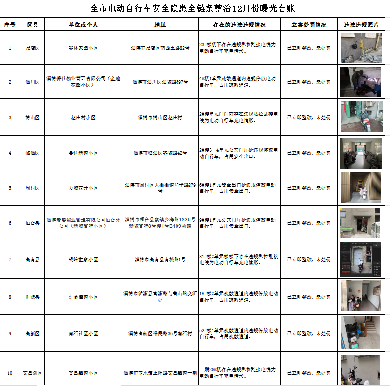 全市电动自行车安全隐患全链条整治工作开展以来,淄博市消防救援支队紧盯重点领域、聚焦关键环节,精准发力、重拳除患,多措并举、综合施策,严格落实重点整治要求,全力防范化解重大安全风险。为有效利用舆论监督和社会监督手段,形成高压震慑,切实发挥警示作用,推动隐患整改,12月30日,淄博市消防救援支队发布全市电动自行车安全隐患全链条整治12月份曝光台账,对10家单位存在的电动自行车违法违规情况开展集中曝光。