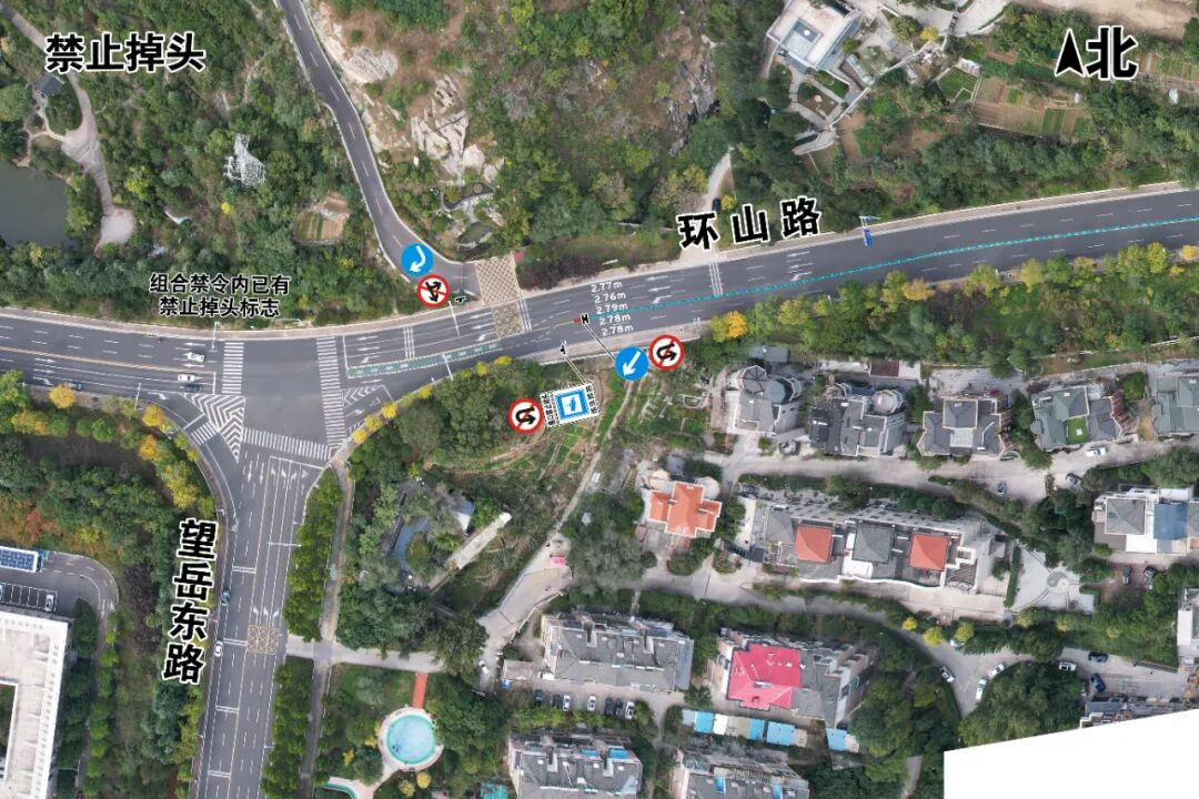 环山路望岳东路路口,禁止自东向西机动车掉头,设置禁令标志及抓拍标志。