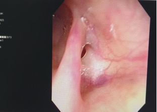 (电子纤维喉镜下的梨状窝瘘内瘘口)