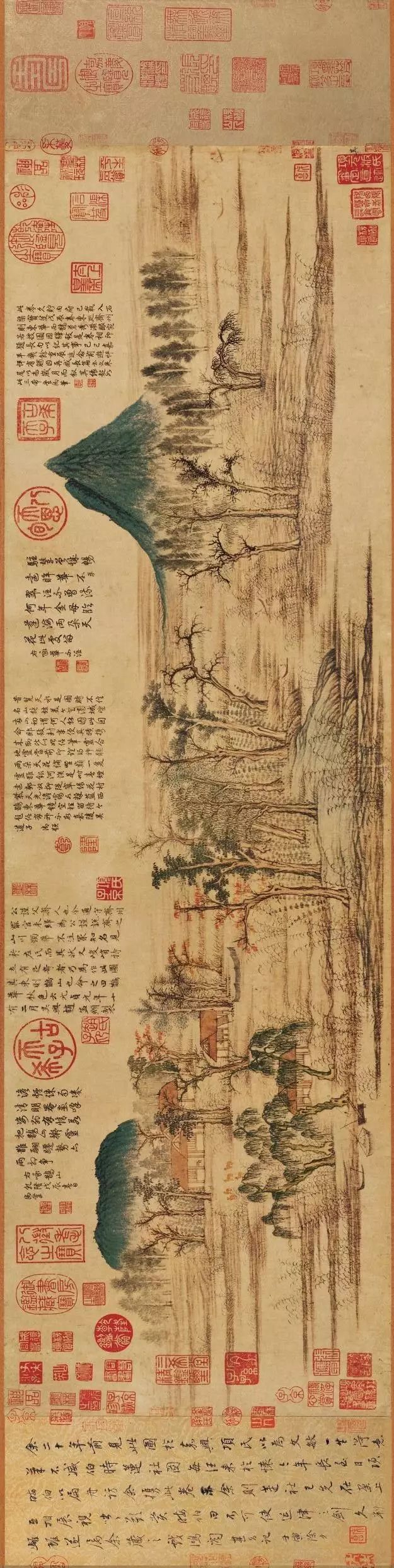 在这幅图上,赵孟頫以艺术化的构思,将原本相距数十里的两座山并置在一幅画中,画境清旷恬淡,意蕴悠远。左侧的鹊山圆润如黛,右侧的华不注山挺拔如翠,中间长汀层叠,渔舟出没,村舍掩映,树木错落有致,赤黄相间,笔法虚实相生,潇洒俊逸,尽显空灵意境与笔墨神韵。