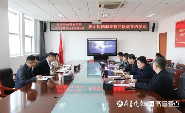 12月29日,枣庄科技职业学院与中文云数字技术有限公司在该院举行校企协同职业技能培训签约仪式。学校党委副书记、院长闵祥寨,招生就业处处长吴洪波,建筑工程学院院长贾佳,信息工程学院院长张峰连,中文云数字经济技术有限公司总经理苏明,中文云数字技术(山东)有限公司总经理晋灵芝、副总经理张中科出席签约仪式,会议由学校党委委员、副院长赵曰国主持。
