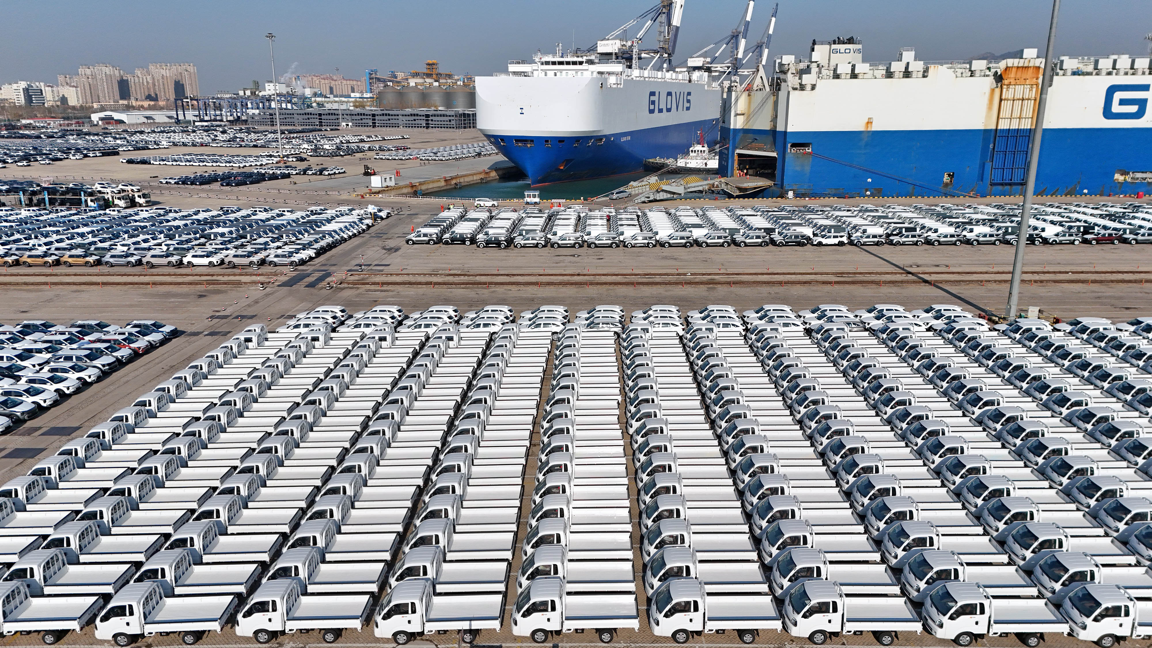 汽车停在山东港口烟台港等待装船。