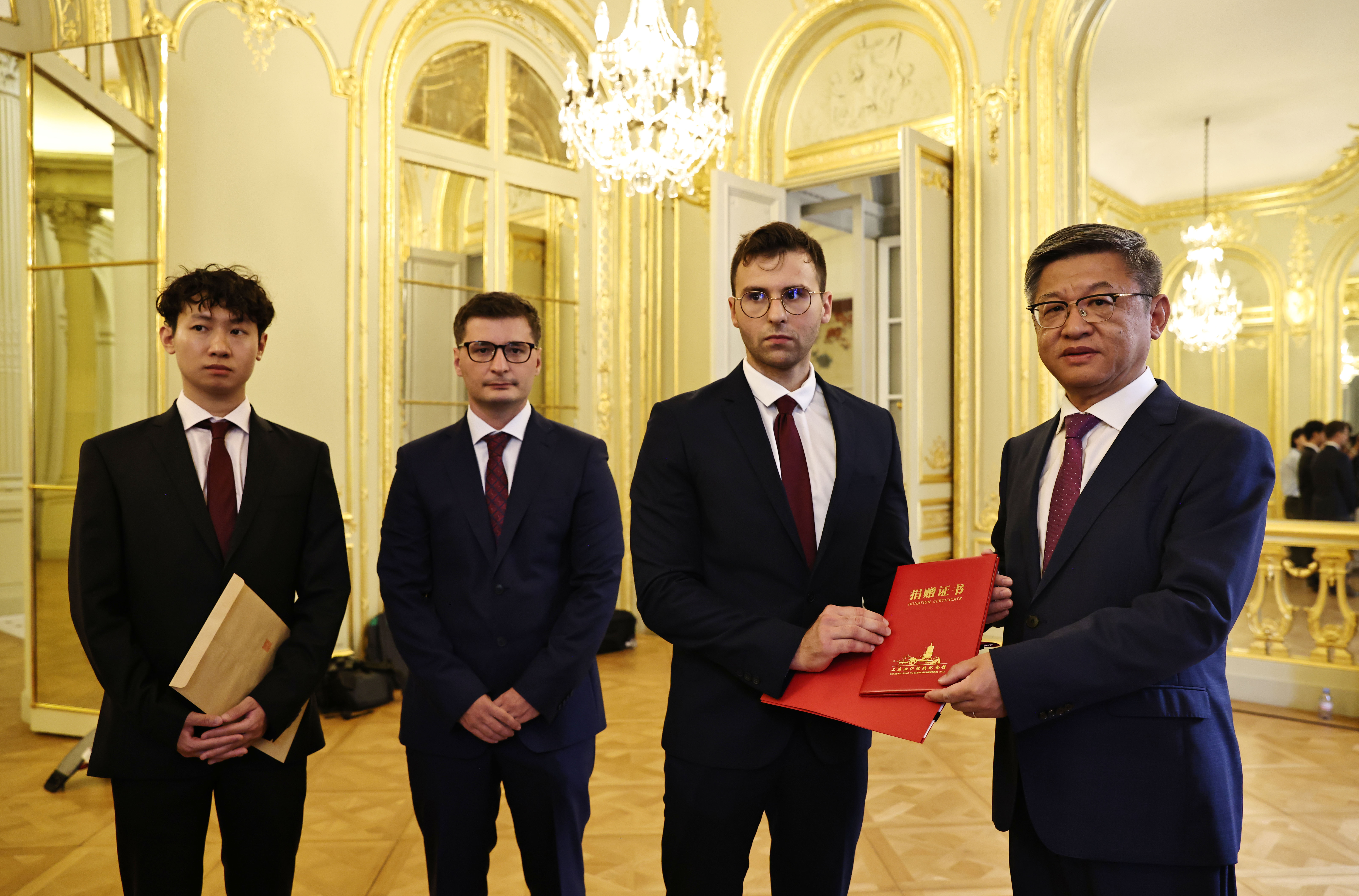 8月4日,照片的正式捐赠仪式在法国巴黎中国驻法大使馆举行。捐赠仪式上,大使馆给三人颁发了感谢信和存储着照片电子版的青花瓷U盘。