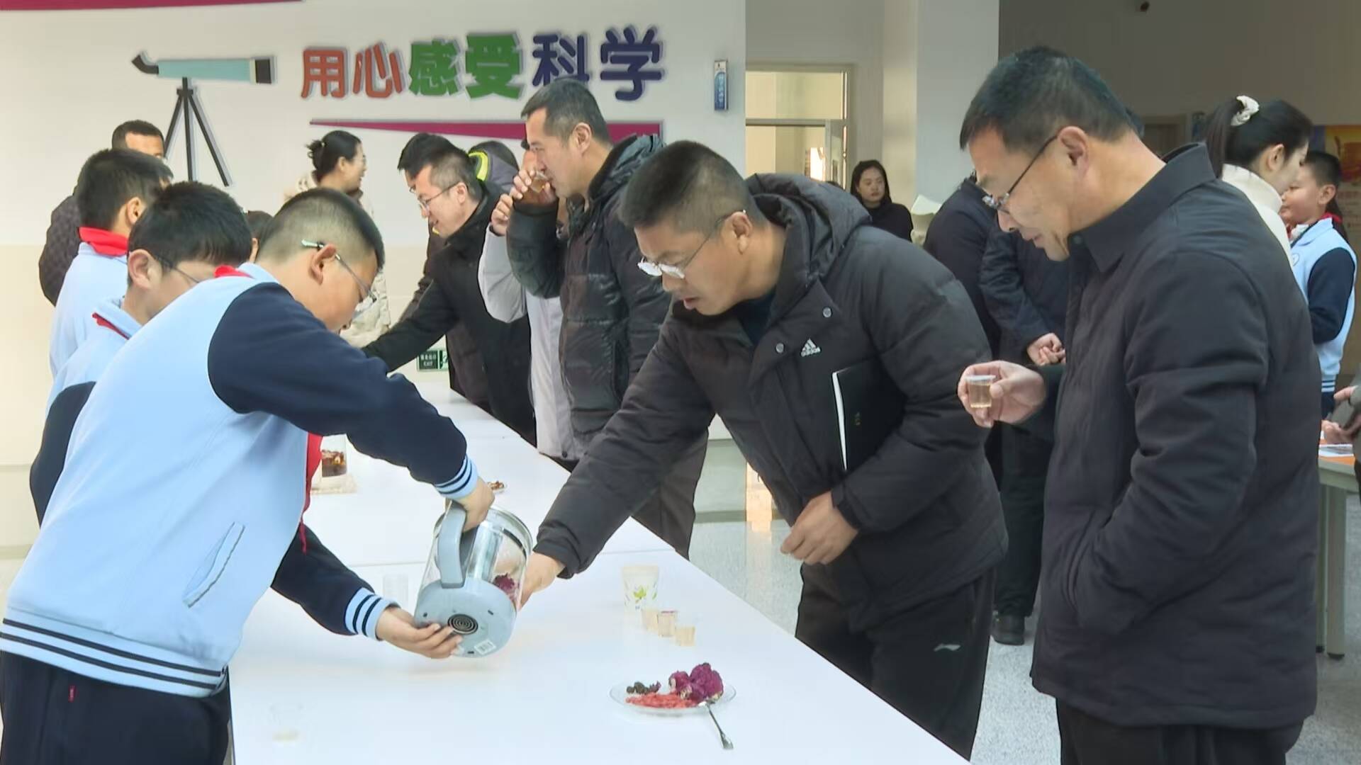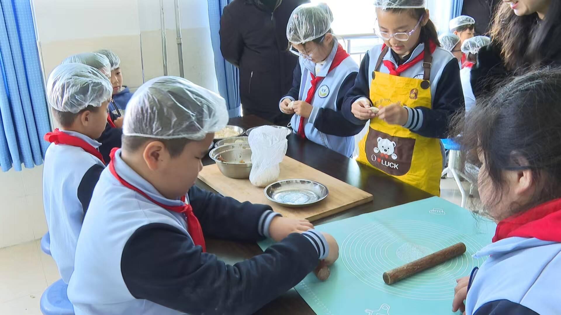 与会人员首先实地观摩了乳山市第一实验小学精心设计的中医药文化实践活动。活动现场设置了多个实践操作区,学生们在老师指导下动手制作艾条、中药香囊、中草药手工皂,体验泡制姜茶、红枣枸杞茶,制作养生面条和饺子,生动展现了中医药与日常生活的紧密联系。此外,学校还通过校本课程展示了香牌制作、中医穴位护眼、刮痧体验等活动。操场上,三年级学生集体展示了传统健身功法八段锦;阶梯教室内,低年级学生则以朗诵中医药三字经的形式,呈现了学校将中医药文化融入教育教学的阶段性成果。