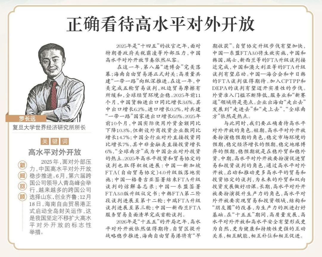 【新闻回顾】2025年,面对外部压力,中国高水平对外开放稳步推进。6月,第六届跨国公司领导人青岛峰会举行,越来越多的跨国公司选择山东、创业齐鲁;12月18日,海南自由贸易港正式启动全岛封关运作,这是我国坚定不移扩大高水平对外开放的标志性举措。