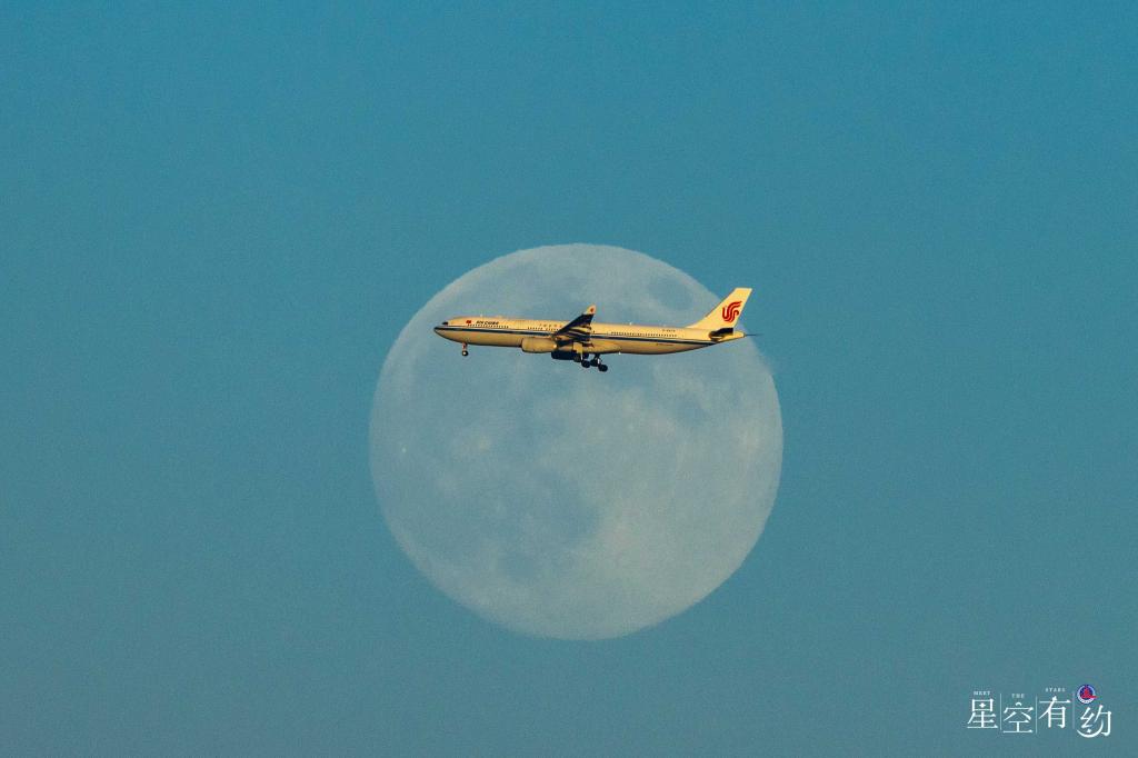 2025年12月4日晚,在北京市拍摄的一架飞机飞过超级月亮。(吴鲁萍 摄)