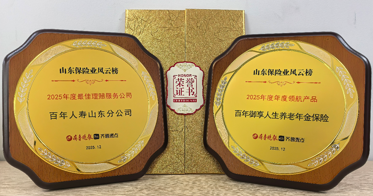 2025年12月,在由齐鲁晚报·齐鲁壹点主办的“影响山东·2025年度山东保险业影响力评选”活动中,百年人寿山东分公司凭借在服务领域的持续卓越表现,荣获“2025年度最佳理赔服务公司”称号。同时,公司旗下产品“百年御享人生养老年金保险”被评为“年度领航产品”。