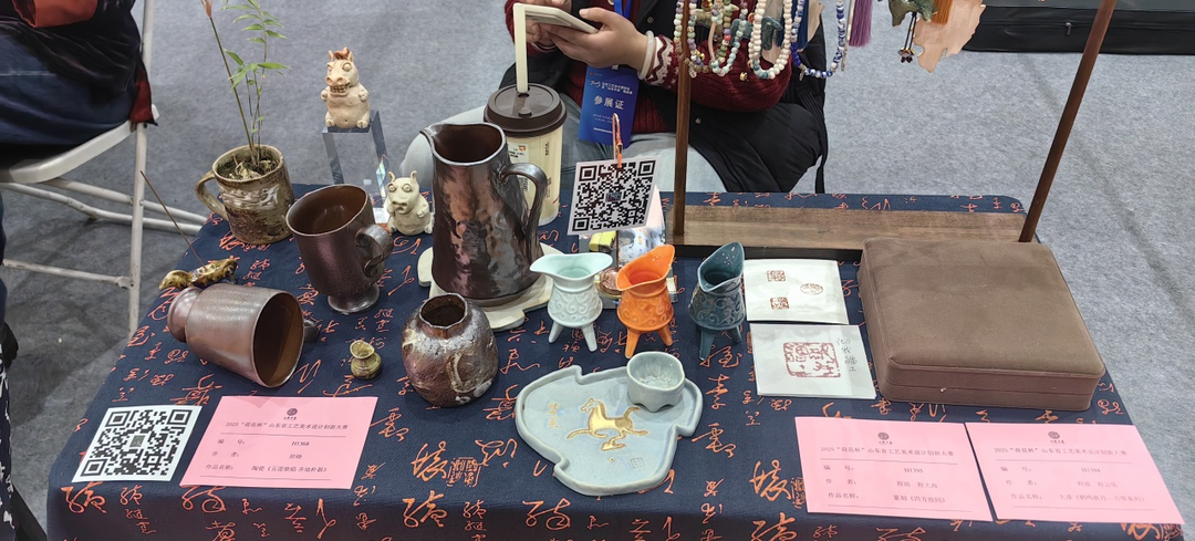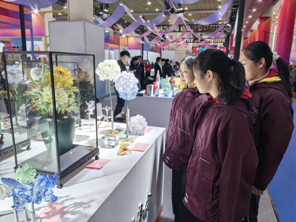 除了掐丝珐琅展区的作品,师生们还参观了展会的其他特色展区,其中淄博展区的琉璃与陶瓷精品让大家尤为着迷、驻足良久。在淄博琉璃展区,一件件琉璃作品晶莹剔透、色彩斑斓,有的如雨后彩虹般绚烂夺目,有的似冰雪般纯净无瑕,大师们凭借精湛的吹制、塑形技艺,将熔融的琉璃赋予了灵动的生命力。同学们凑近观赏,无不惊叹于琉璃在光影下流转的美感,纷纷感叹:“原来琉璃可以这么美,每一件都像有灵魂一样,能感受到匠人对色彩和造型的极致追求。”