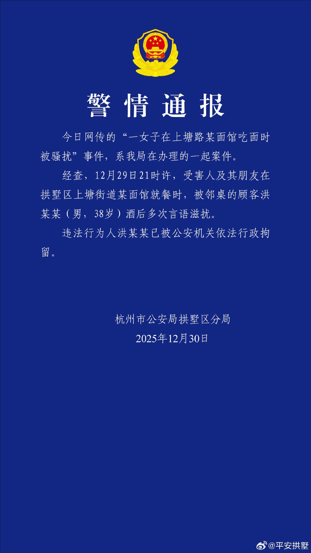 杭州警方通报“女子就餐时被言语骚扰”:涉事男子已被行拘
