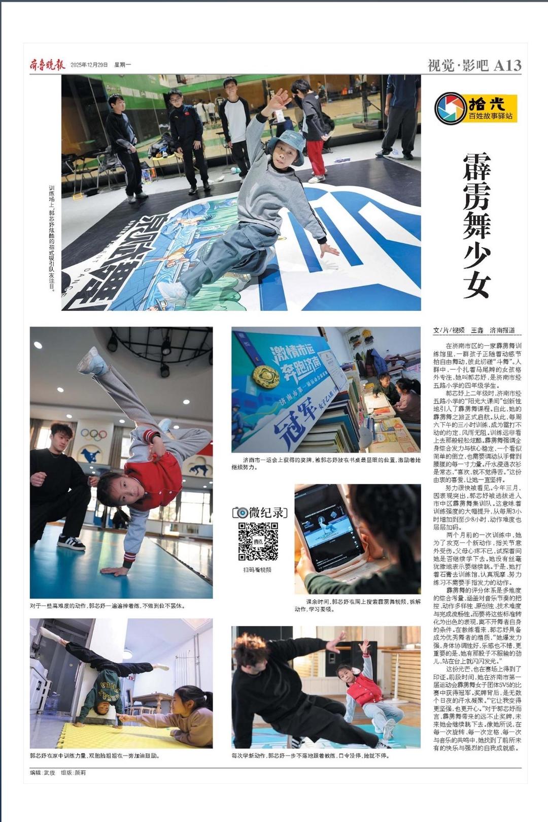 这份光芒,也在赛场上得到了印证。前段时间,她在济南市第一届运动会霹雳舞女子团体5V5的比赛中获得冠军。奖牌背后,是无数个日夜的汗水凝聚。“它让我变得更坚强,也更开心。”对于郭芯妤而言,霹雳舞带来的远不止奖牌,未来她会继续跳下去。像她所说,在每一次旋转,每一次定格,每一次与音乐的共鸣中,她找到了前所未有的快乐与强烈的自我成就感。