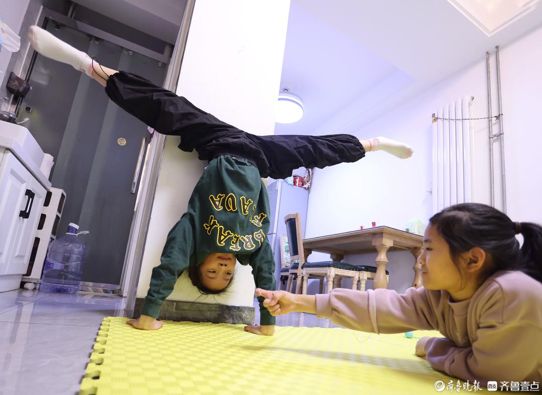 郭芯妤上二年级时,济南市经五路小学的“阳光大课间”创新性地引入了霹雳舞课程。自此,她的霹雳舞之旅正式启航。每周六下午的三小时训练,成为雷打不动的约定。训练远非看上去那般轻松炫酷。霹雳舞强调全身综合发力与核心稳定,一个看似简单的倒立,也需要调动从手臂到腰腹的每一寸力量。汗水浸透衣衫是常态,“喜欢,就不觉得苦。”这份由衷的喜爱,让她一直坚持。