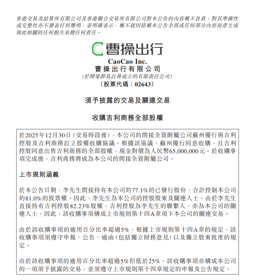 “收购耀出行和吉利商旅,是曹操出行构建‘一站式科技出行平台’的关键战略举措。”曹操出行CEO龚昕表示,“两项收购完成后,我们将打通从日常通勤、商务接待到差旅管理的全场景服务链条,融合耀出行的全球高端服务网络与吉利商旅的智能差旅解决方案,为各类客户提供无缝衔接、标准统一的品质出行体验。这不仅会强化我们在企业出行和商旅服务市场的竞争力,也将支持曹操出行在全球智慧出行领域创造更大价值,实现长远发展。”