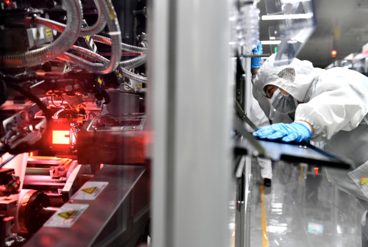 山东吉利欣旺达动力电池有限公司,工作人员在锂电池生产线值守
