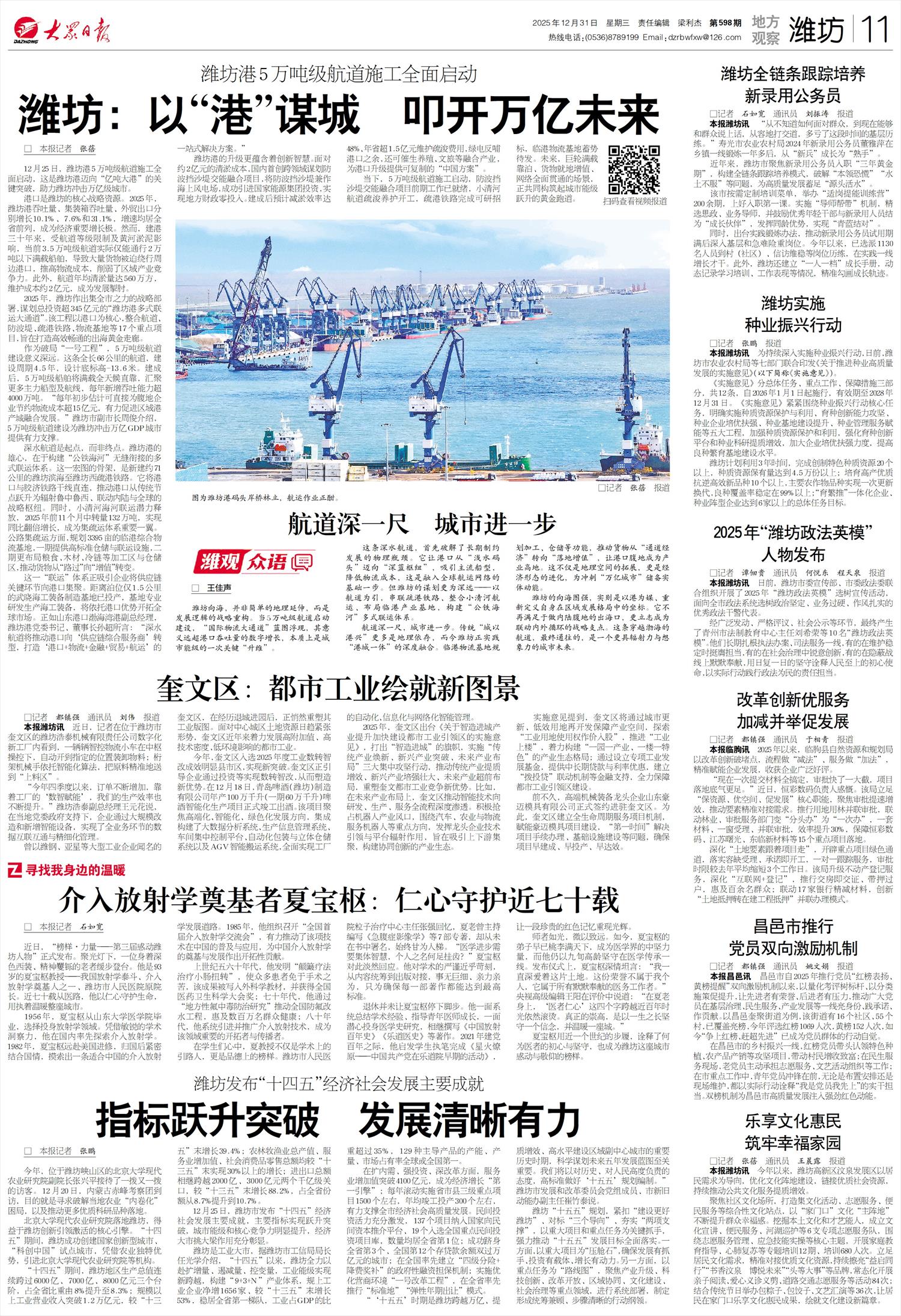 2025年12月25日,潍坊港5万吨级航道施工全面启动,这是潍坊港迈向“亿吨大港”的关键突破,助力潍坊冲击万亿级城市。