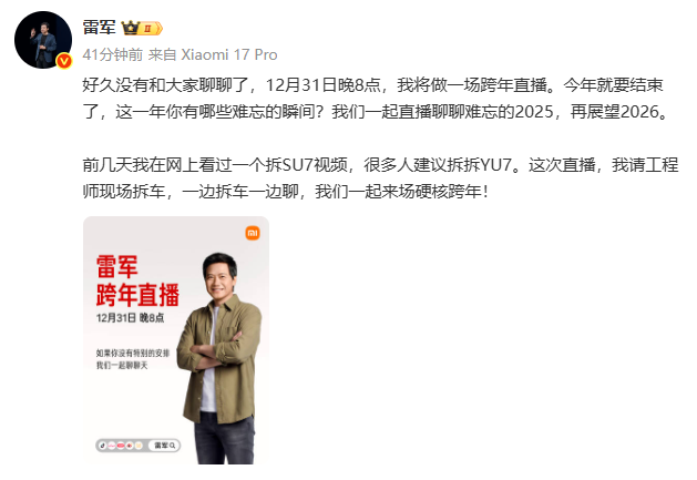 12月31日,雷军表示感冒有点严重,原定跨年的直播只能推迟到1月3日晚7点。此前报道小米创办人、董事长兼CEO雷军宣布,将于12月31日晚8点做一场跨年直播。雷军在其个人微博表示,“前几天我在网上看过一个拆SU7视频,很多人建议拆拆YU7。这次直播,我请工程师现场拆车,一边拆车一边聊。”(雷军新浪微博)