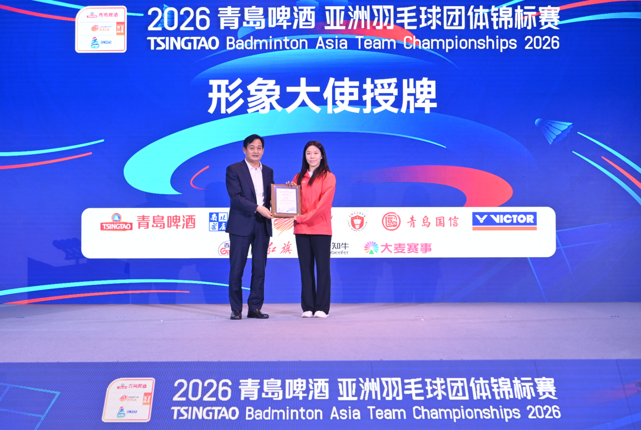启动仪式现场,巴黎奥运会女双冠军贾一凡被授予“2026年青岛啤酒亚洲羽毛球团体锦标赛形象大使”称号,青岛市政府副市长赵胜村为其授牌。