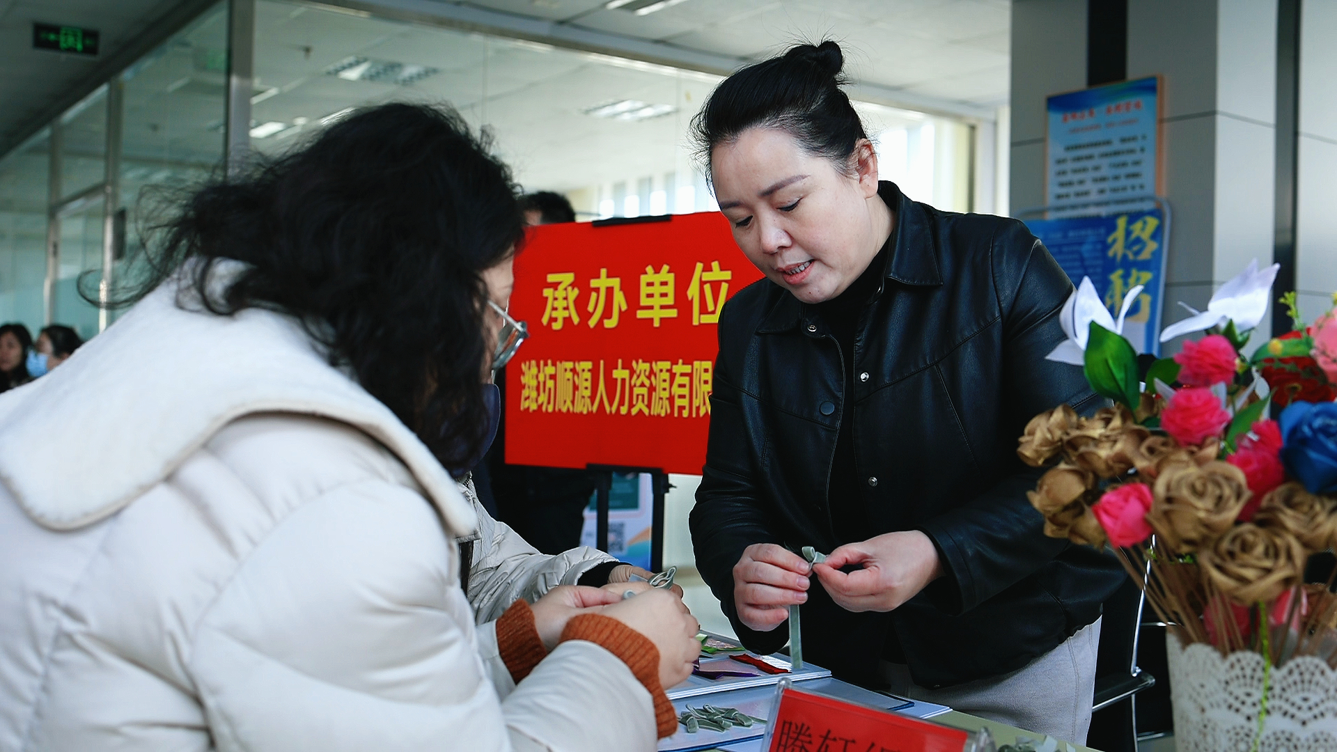 “多一门手艺,就多一份底气。”在潍坊昌乐县“宝都乐就业综合体”的冬季招聘会现场,潍坊腾轩工艺品厂负责人何玉霞一边展示精美的编织作品,一边向围拢过来的求职者讲解。她的创业项目吸引了不少人驻足,不一会儿,就有好几位求职者跟着学起了编织手法。