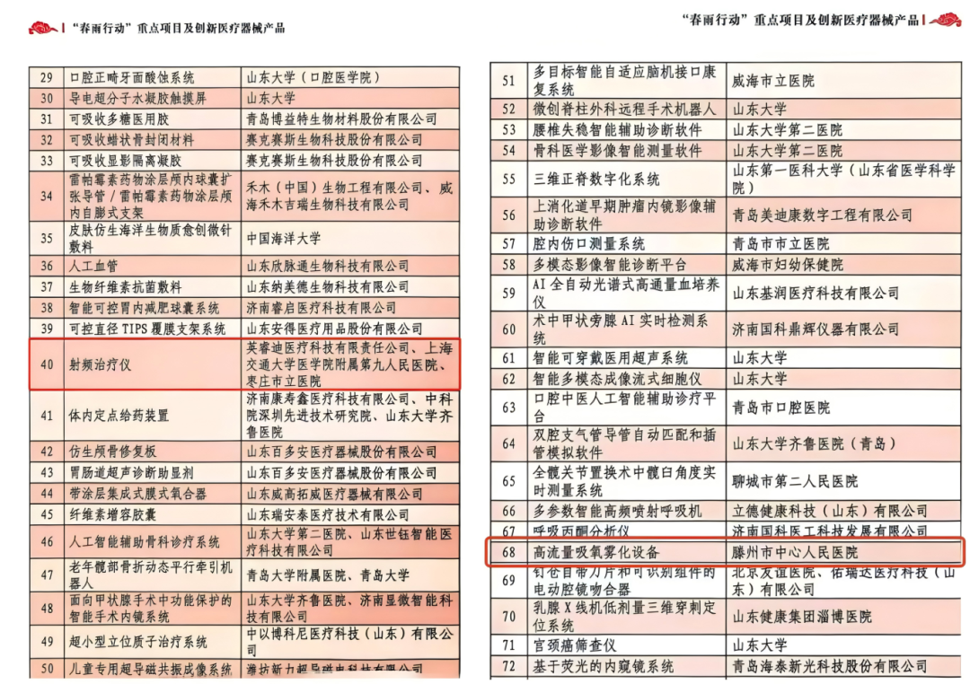 近日,在全省“春雨行动”医疗器械临床研究成果转化推进会上,枣庄市申报的“BeaShape射频治疗仪”与“高流量吸氧雾化设备”两个项目,成功入选全省“春雨行动”重点项目及创新医疗器械产品名单。此次全省共公布80个重点项目,近九成来自省内外知名高校、附属医院及大型生产企业,在由地市级医院成功申报的9个项目中,我市独占2席,其中,滕州市中心人民医院的“高流量吸氧雾化设备”是全省唯一一个由县级医院独立申报并入选的重点项目。