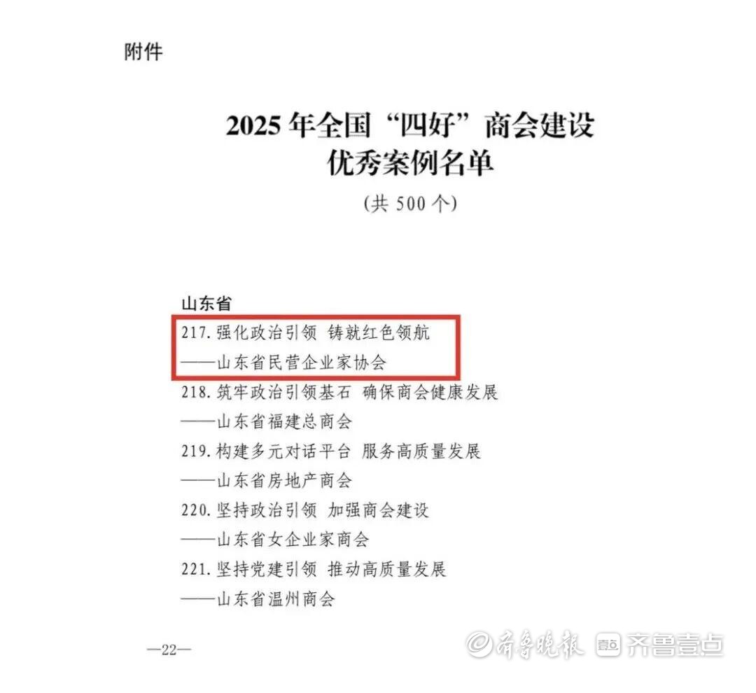 近日,全国工商联公布2025年全国“四好”商会建设优秀案例名单,山东省民营企业家协会凭借《强化政治引领 铸就红色领航》优秀案例成功入选。