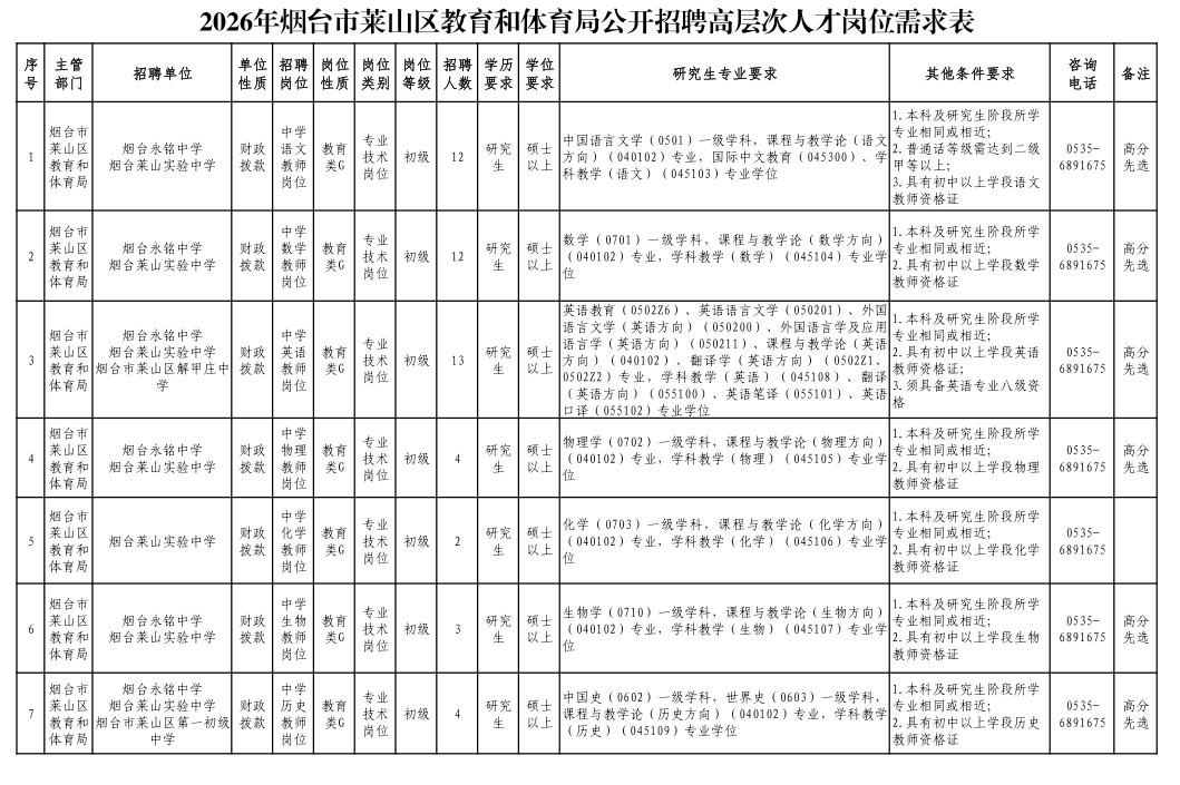 直接面试!2026年烟台市莱山区教体局招聘70名高层次人才