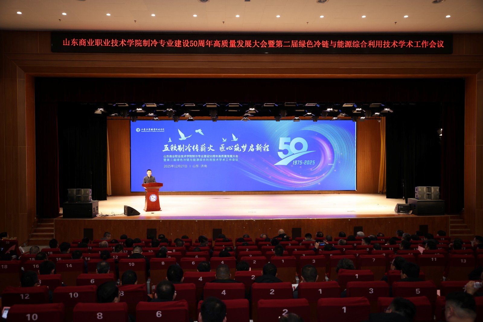 12月27日,制冷专业建设50周年高质量发展大会暨第二届绿色冷链与能源综合利用技术学术工作会议在山东商业职业技术学院召开。机械工业教育发展中心工程教育与职业教育处处长吕冬明,中国制冷学会副秘书长王从飞,中国制冷空调工业协会副秘书长陈敬良,山东制冷学会理事长李永安,山东省家用电器行业协会会长田占军,冰轮环境技术股份有限公司副总裁张会明,山东商业职业技术学院党委书记邓迎迎,党委副书记、院长张宗国等领导嘉宾出席会议。来自院校、企业代表,学校制冷专业离退休教师、历届校友及在校师生代表共计900余人参会。会议由学校党委副书记宋超,党委委员、副院长方玉鹏主持。