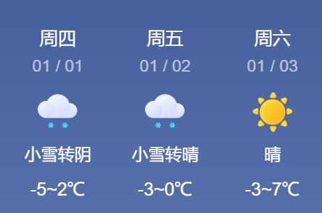 预计2026年元旦假期(1月1-3日)期间,我市有一次小雪天气,出现在1日白天到夜间,其他时段多云间晴;1日夜间北风短时较大;1-2日气温较低,3日小幅回升。假期出行需防范降雪、低温的不利影响。