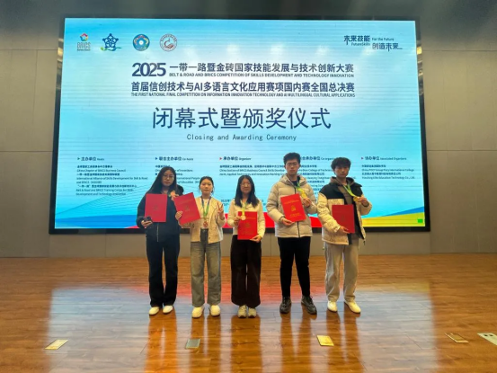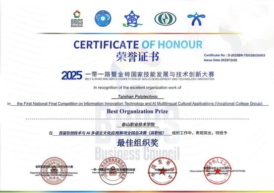 12月27日,2025一带一路暨金砖国家技能发展与技术创新大赛首届信创技术与AI多语言文化应用赛项全国总决赛在河北曹妃甸圆满落幕。泰山职业技术学院信息技术工程系李子涵、孙智超同学获学生组一等奖,尚歆、王子涵同学获得学生组三等奖,郑翠翠老师获职工组三等奖,学校获“最佳组织奖”。