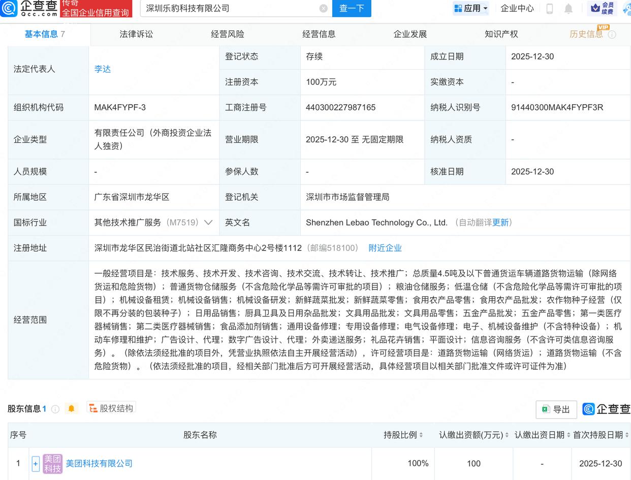 美团在深圳成立乐豹科技公司企查查 2025-12-31 11:07:11企查查APP显示,近日,深圳乐豹科技有限公司成立,经营范围包含:五金产品零售;第一类医疗器械销售;第二类医疗器械销售;食品添加剂销售等。企查查股权穿透显示,该公司由美团科技有限公司全资持股。(企查查)责任编辑:刁俊艳