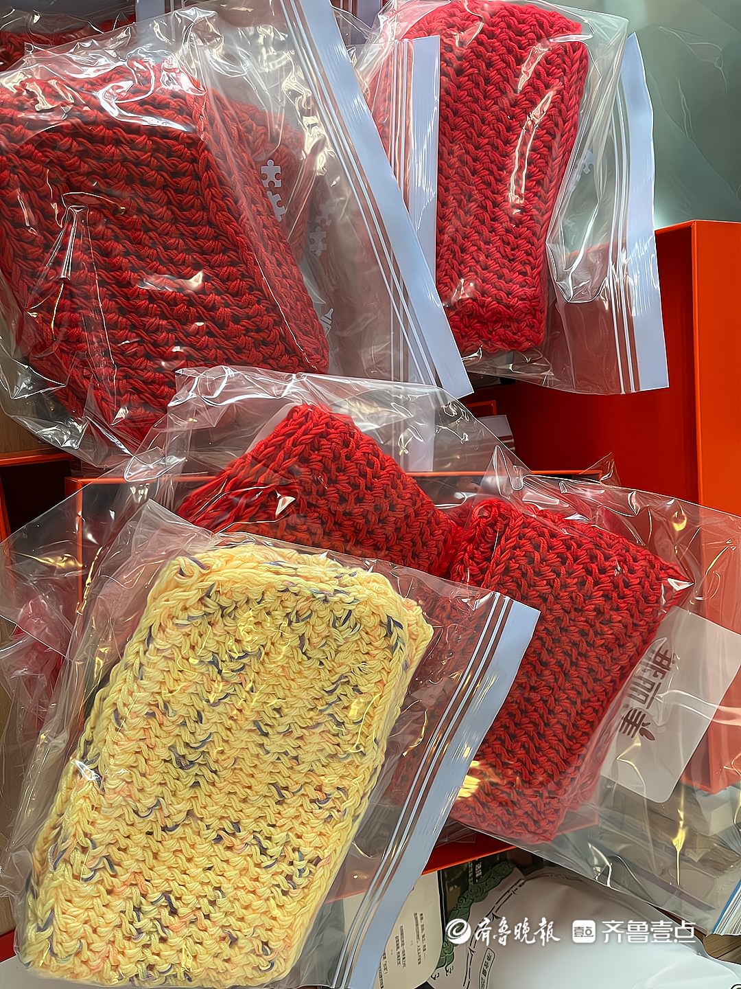 26条围巾颜色各异,其中最多的就是热烈的红色和活泼的黄色,每条都带着整齐的花纹,针脚紧实,摸起来格外厚实。