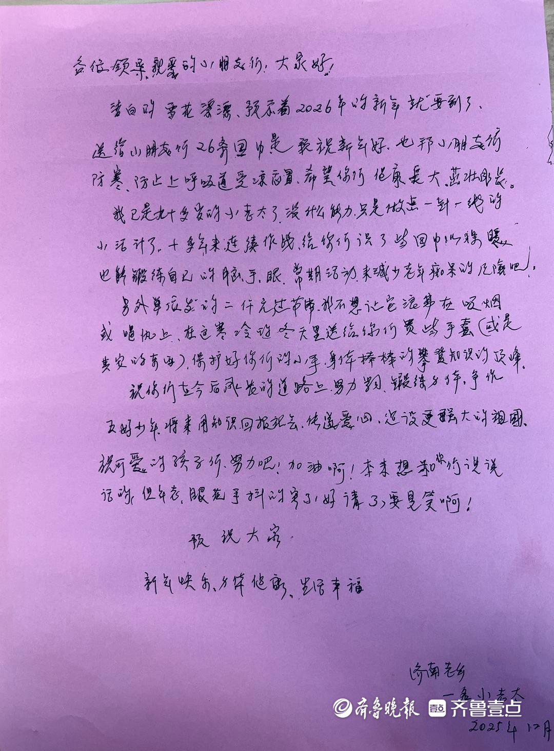 彭奶奶的围巾送到齐鲁晚报·齐鲁壹点编辑部时,工作人员早已满心期待。“每年冬天最盼的就是彭奶奶的包裹,看到包裹就知道她身体硬朗,心里特别踏实。”壹点公益工作人员说。拆开包裹后,那封署名为“济南老乡,一名小老太”的手写信,依旧让大家感动不已。