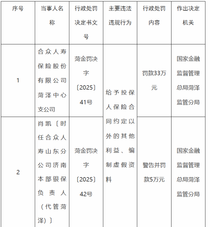 12月30日,国家金融监督管理总局山东监管局官网公示的行政处罚决定书显示,合众人寿保险股份有限公司菏泽中心支公司因给予投保人保险合同约定以外的其他利益、编制虚假资料被罚款33万元。同时,时任合众人寿山东分公司济南本部银保负责人(代管菏泽)的肖凯被警告并罚款5万元。