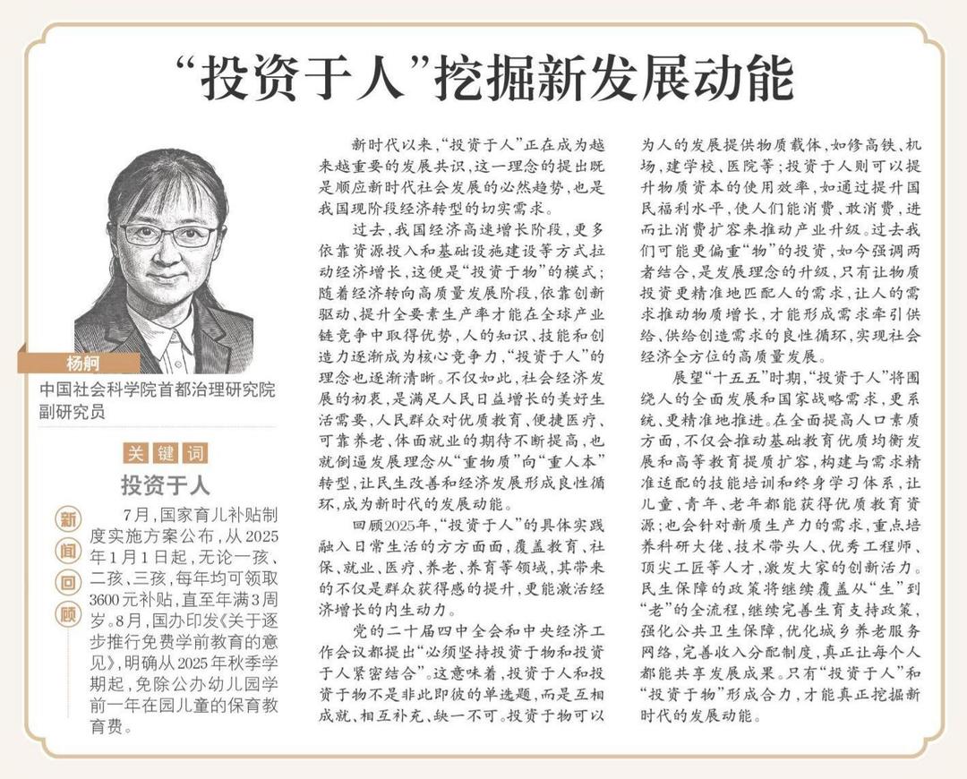 回顾2025年,“投资于人”的具体实践融入日常生活的方方面面,覆盖教育、社保、就业、医疗、养老、养育等领域,其带来的不仅是群众获得感的提升,更能激活经济增长的内生动力。