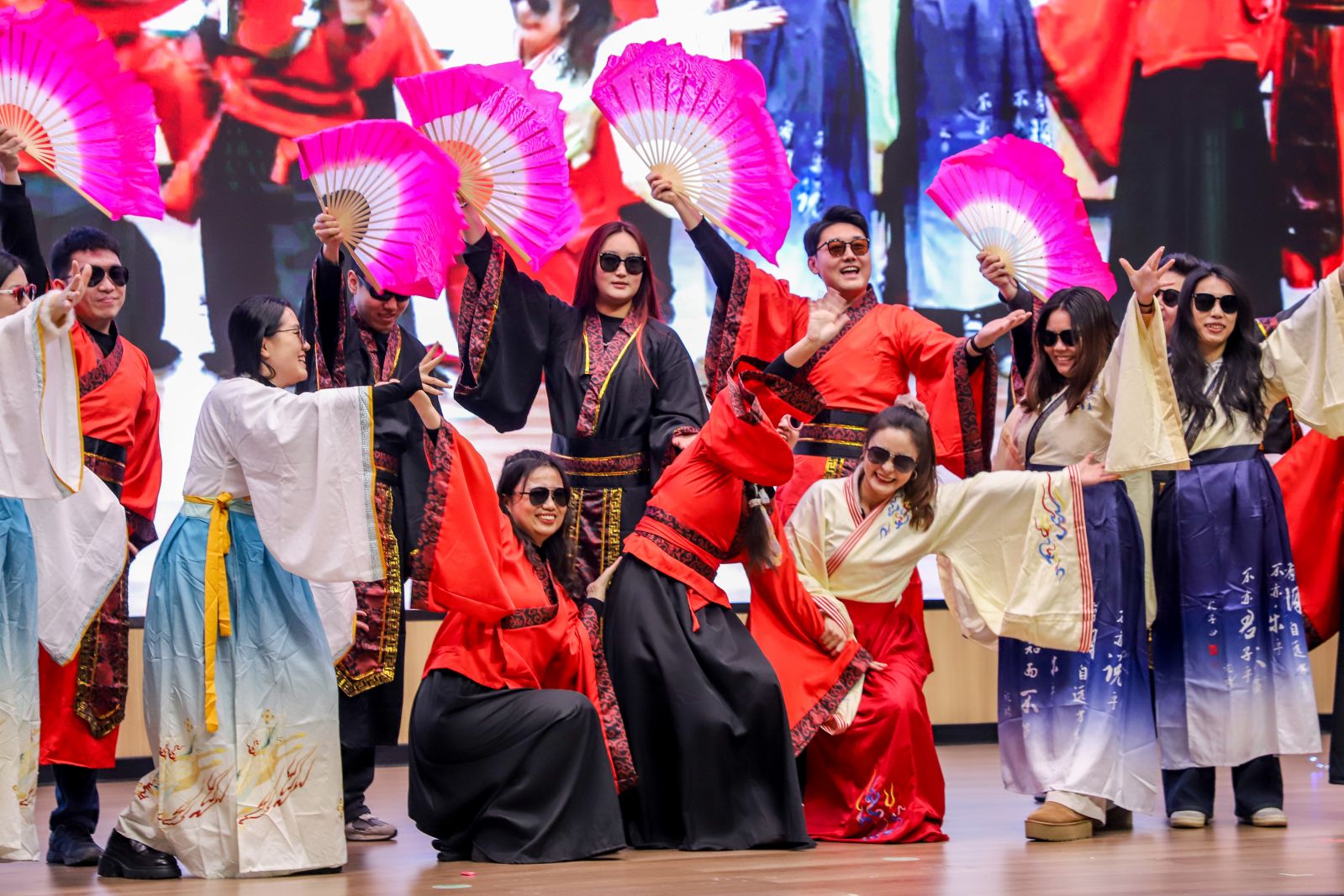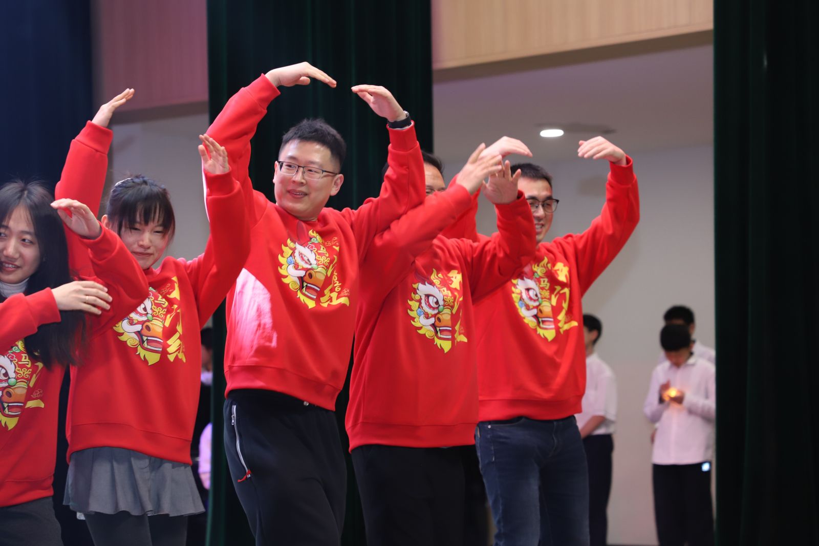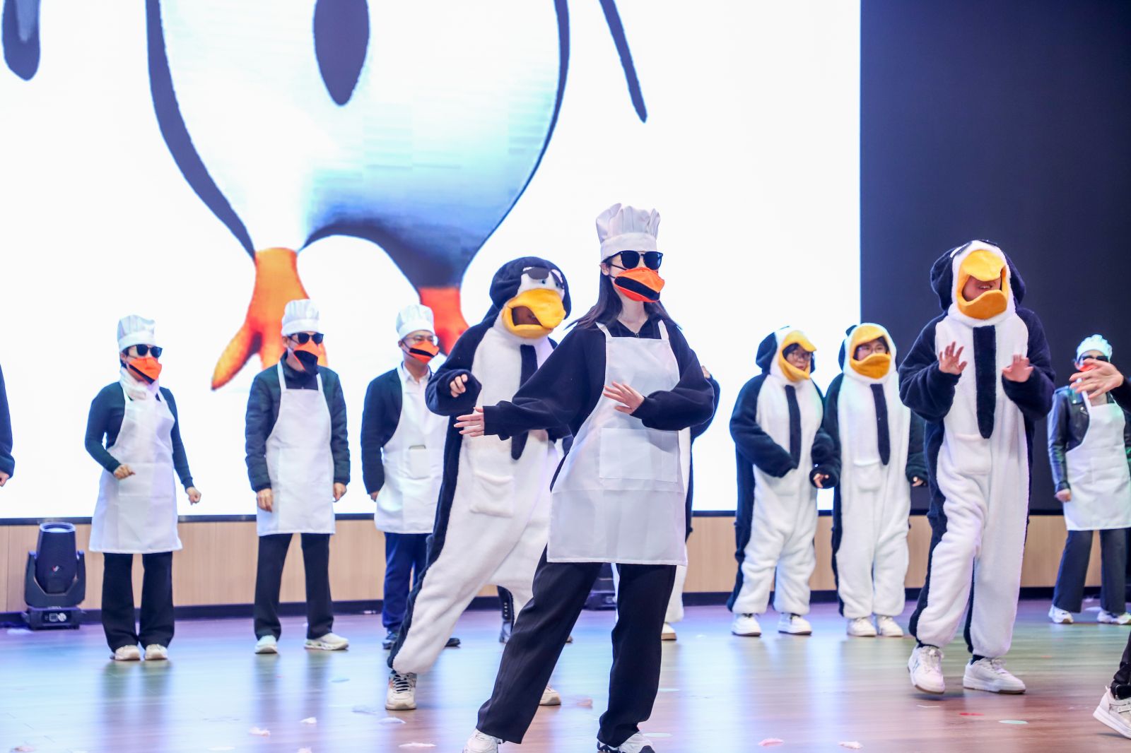 作为狂欢节的“保留王牌”,教师创意互动环节再度成为全场焦点。老师们打破课堂常规,化身“快乐使者”:小学部王福进、于菲校长以“巡山大王”造型惊喜现身,马晓光校长cosplay“姜子牙”送上新年寄语,鼓励同学们“保持对世界的好奇、对自我的觉察、对目标的执着”;还有教师团队带来的“企鹅舞”“动物睡衣舞”等趣味表演,与学生们亲密互动、同台狂欢,彻底点燃现场氛围,让校园充满欢声笑语。