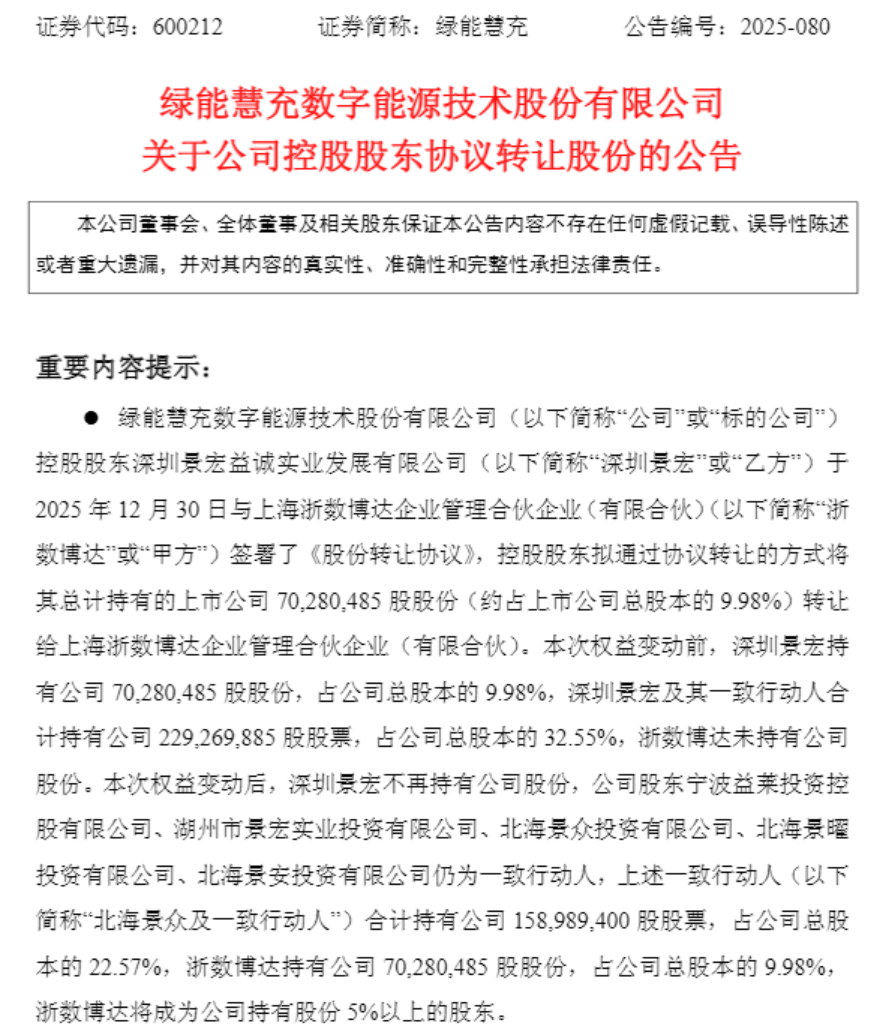 12月30日晚,绿能慧充(600212.SH)公告称,公司控股股东深圳景宏益诚实业发展有限公司(下称“深圳景宏”)拟通过协议转让的方式将其总计持有的7028.05万股股份转让给上海浙数博达企业管理合伙企业(有限合伙)(下称“浙数博达”),交易金额为5.6亿元。