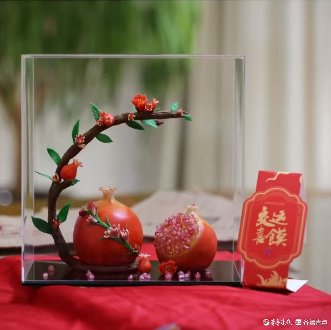 “我们还研发了石榴面塑产品。你看它既有整体石榴的雕刻,也有将石榴与其他元素相结合的创作。师傅们精确把握每一个细节,以保证石榴面塑的逼真度和美观度。”她指着一个半环状石榴面塑介绍,栩栩如生的石榴爆开晶莹剔透的石榴籽,真的可以以假乱真了。