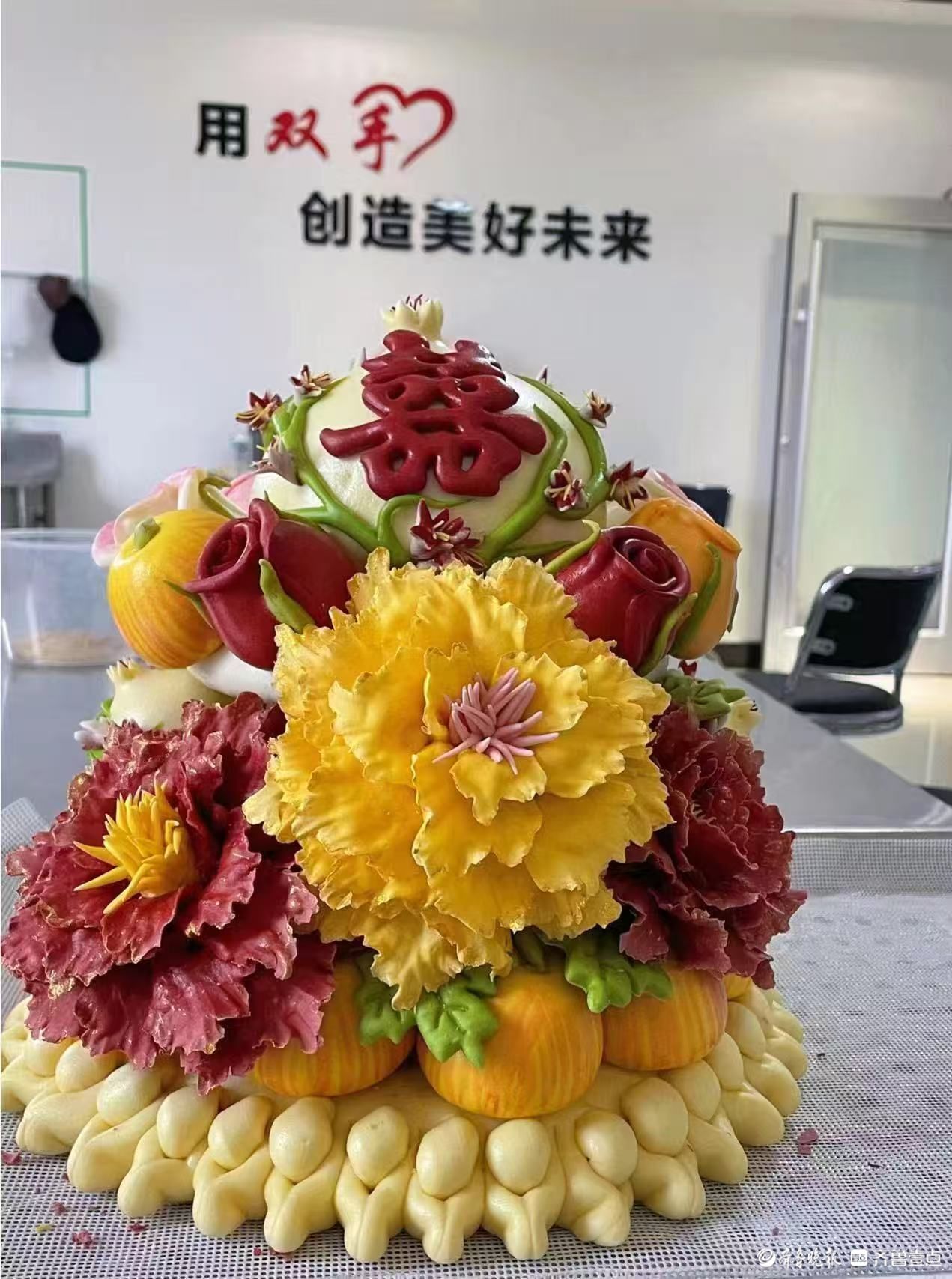 “红石榴”花馍作为传统手艺的匠心典范,源自传承、兴于创新,原材料全部采用优质面粉和新鲜的果蔬汁,无色素添加,融合了粮食和瓜果蔬菜的营养,黄色为南瓜、绿色为菠菜、橙色为胡萝卜、红色为红曲米。让市民在享受艺术欣赏的同时,还能够品尝到健康的食品。