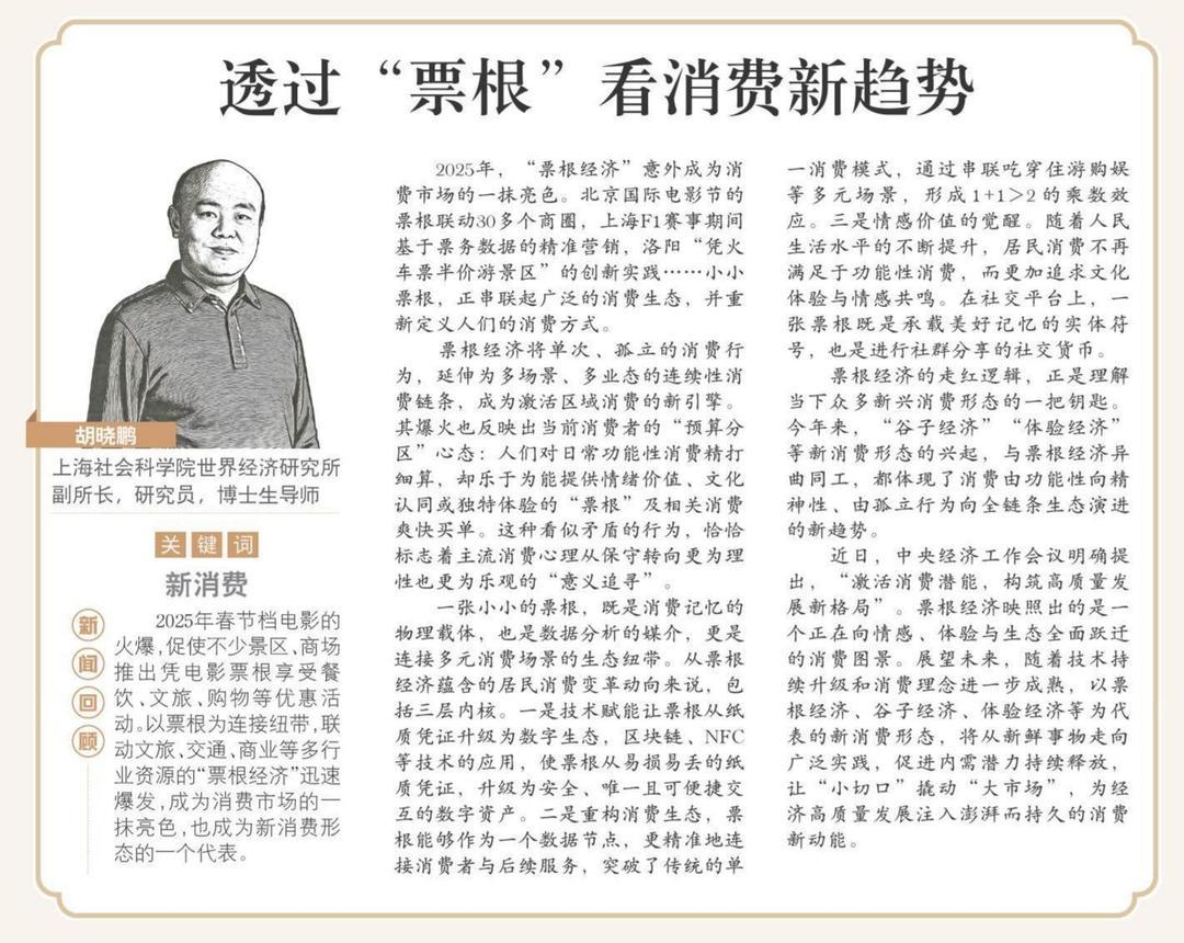 【新闻回顾】2025年春节档电影的火爆,促使不少景区、商场推出凭电影票根享受餐饮、文旅、购物等优惠活动。以票根为连接纽带,联动文旅、交通、商业等多行业资源的“票根经济”迅速爆发,成为消费市场的一抹亮色,也成为新消费形态的一个代表。